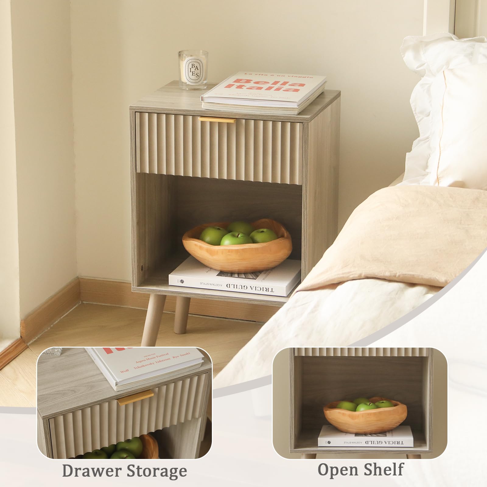 • Mid Century Modern Nightstand, Wood Bedside Table with Drawer and Opening Storage7